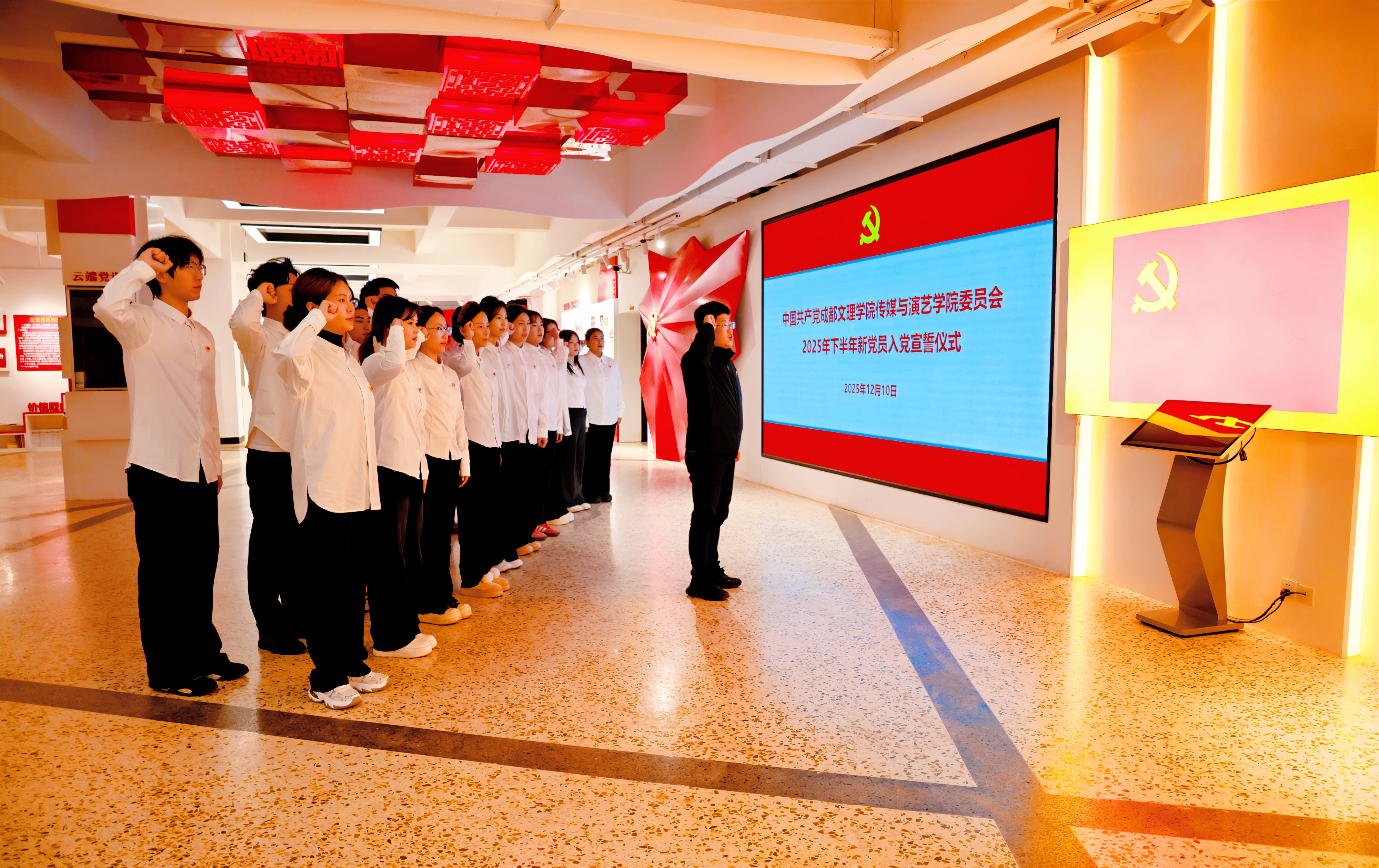 2025年12月10日下午16时30分,传媒与演艺公司党委在行政楼“文理先锋驿站”党员活动室庄严举行2025年下半年新发展党员入党宣誓仪式。公司党委书记韩杰、员工党支部书记及本期全体新发展党员参加了仪式。仪式由公司党委组织员缪佳栖主持。